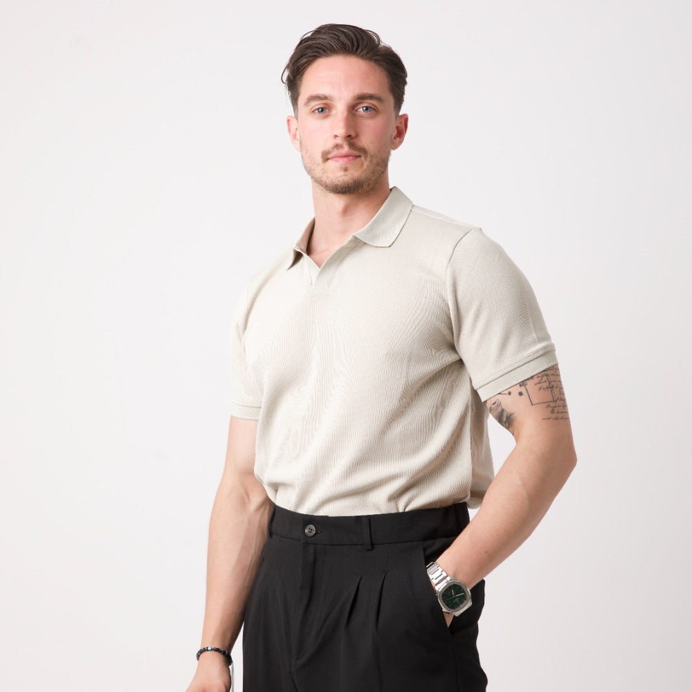 GentFashion stilinin yalın ve zarif temsilcisi: Düğmesiz Polo Yaka Triko Tişört.