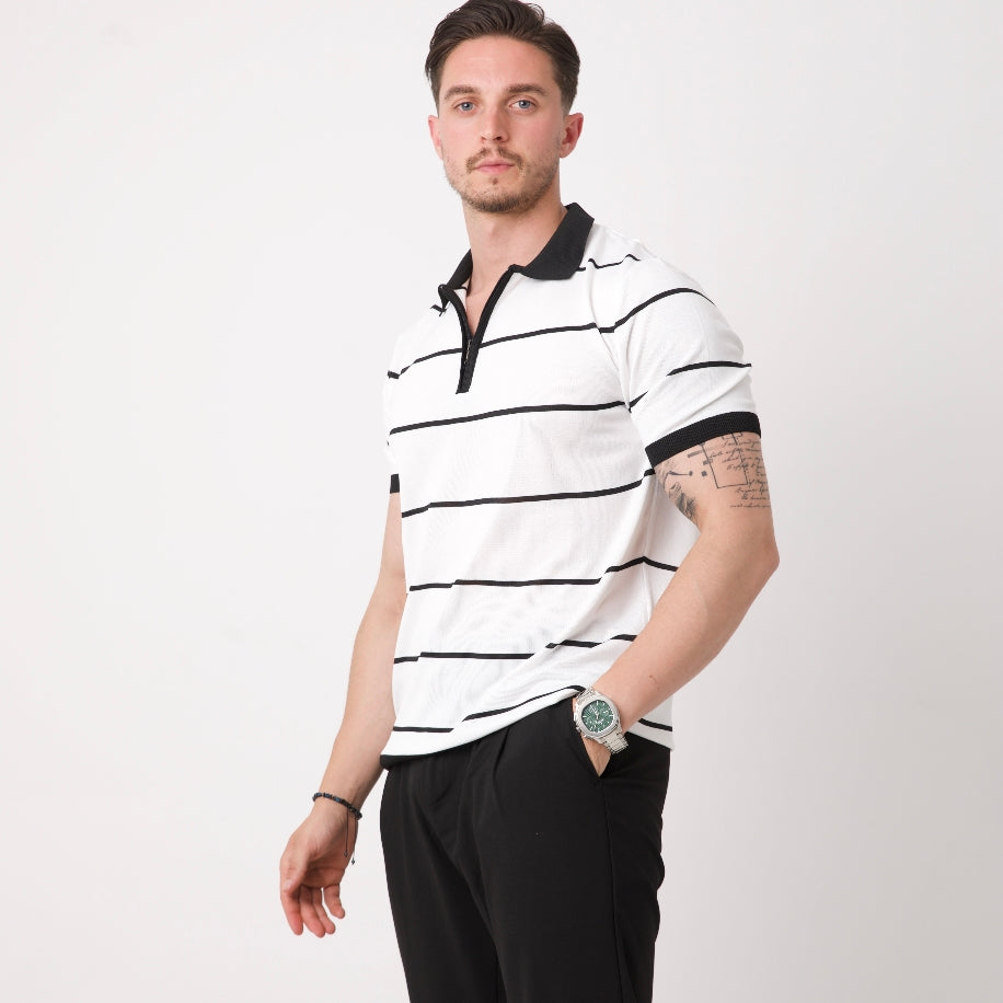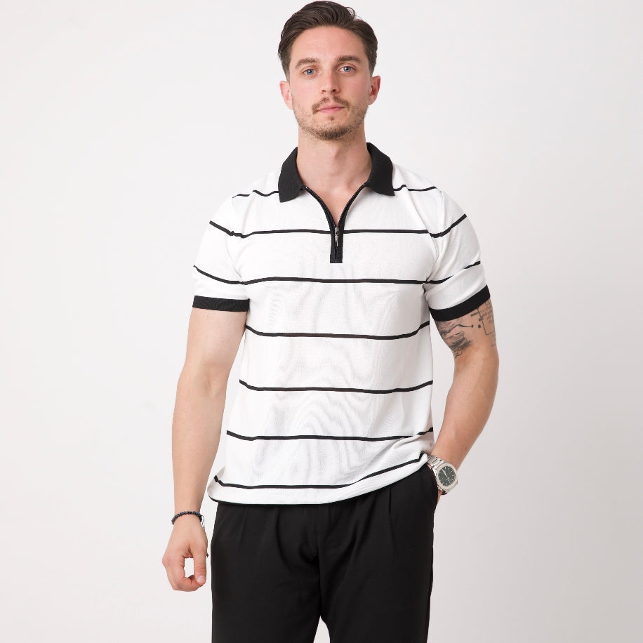 Siyah Çizgili Beyaz Polo Yaka Triko Tişört