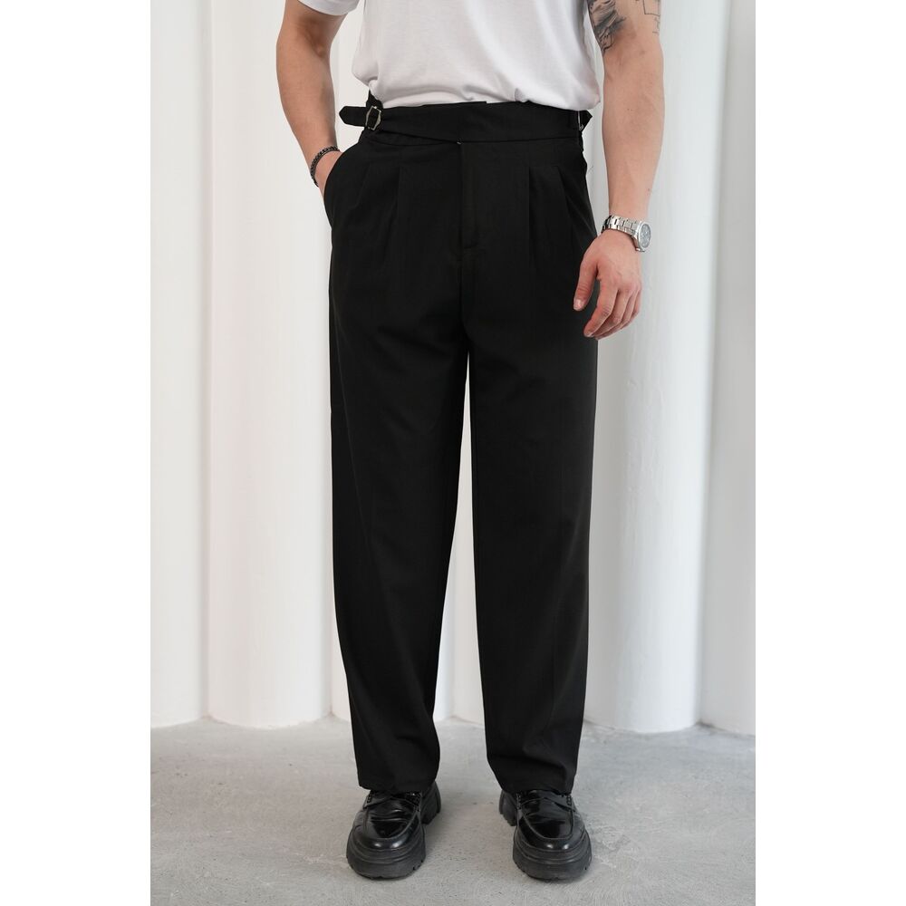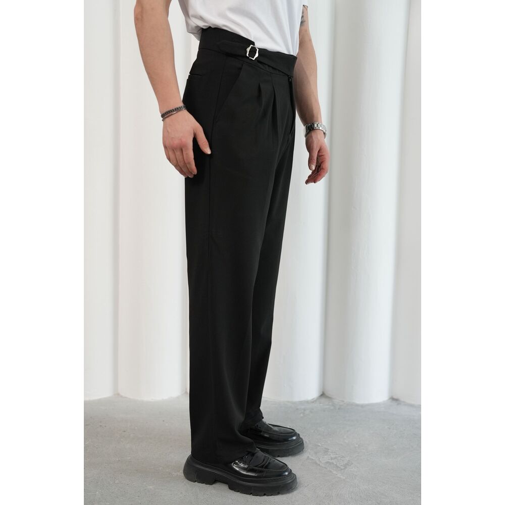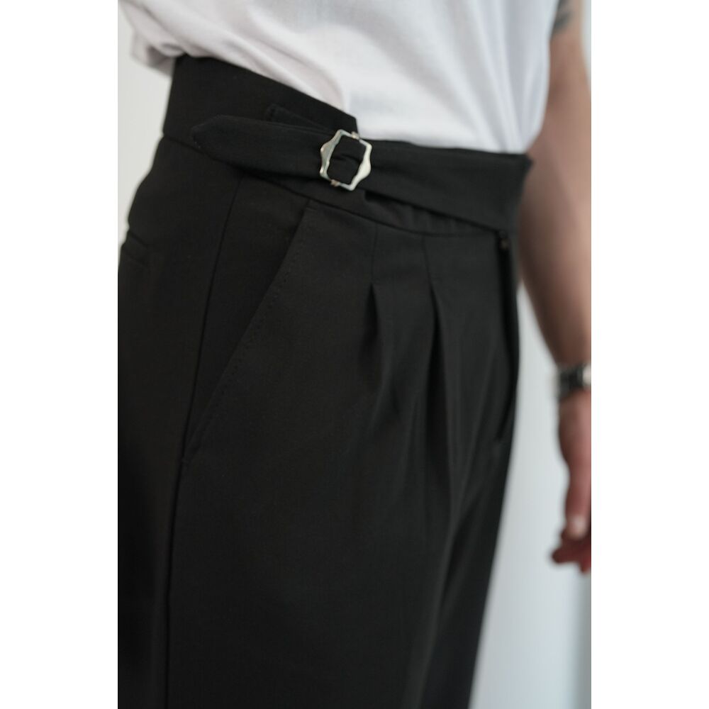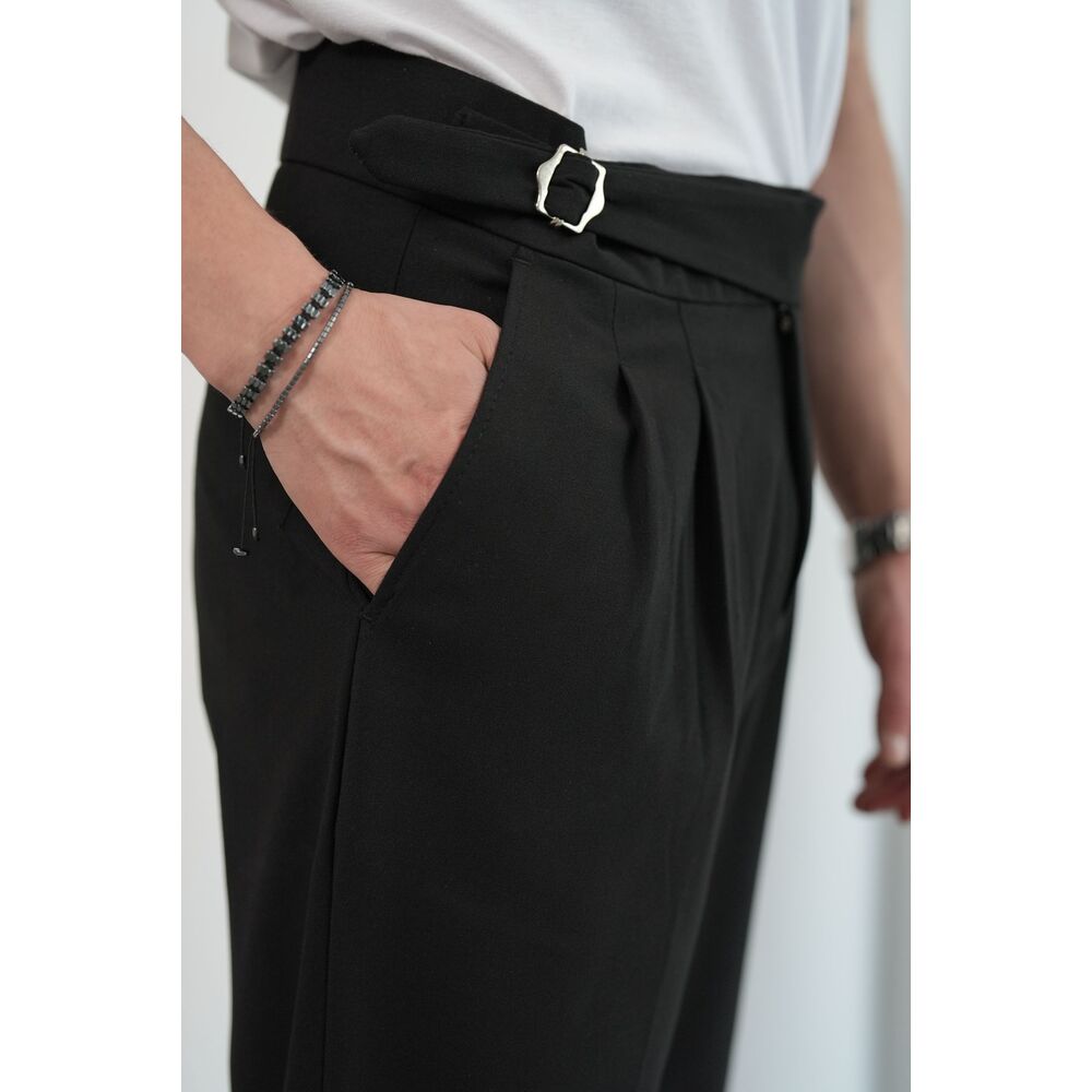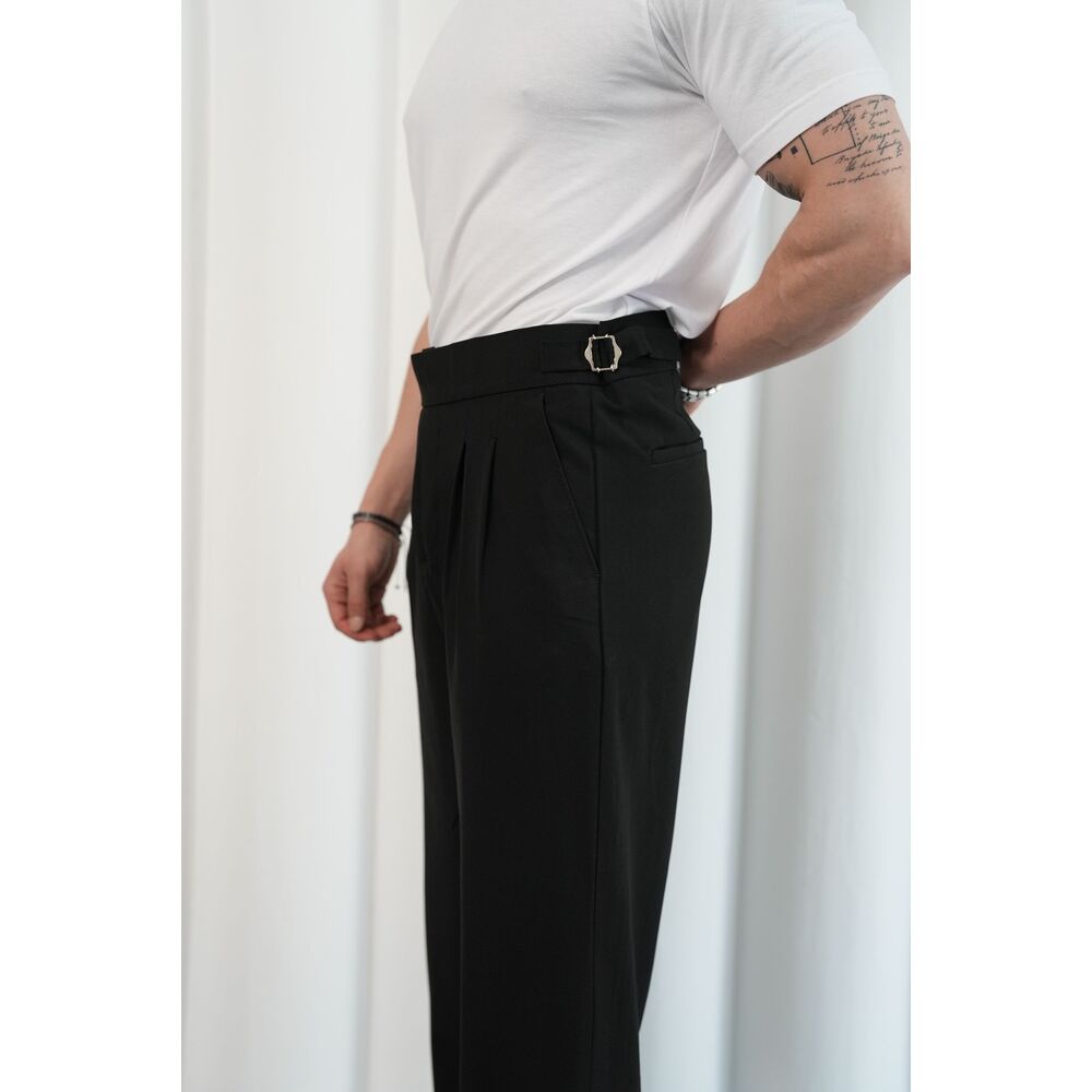 Siyah Çift Tokalı İtalyan Kesim Pileli Kumaş Pantolon